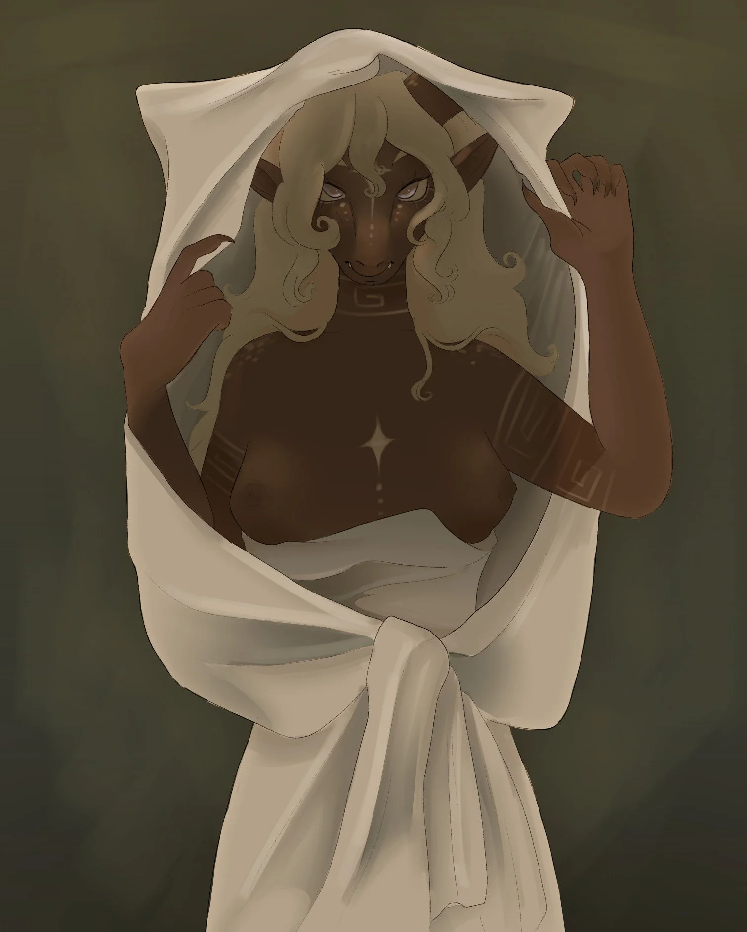 This is a half body illustration of Sariel, my draconic-humanoid character draped in cloth with subtle lighting.
