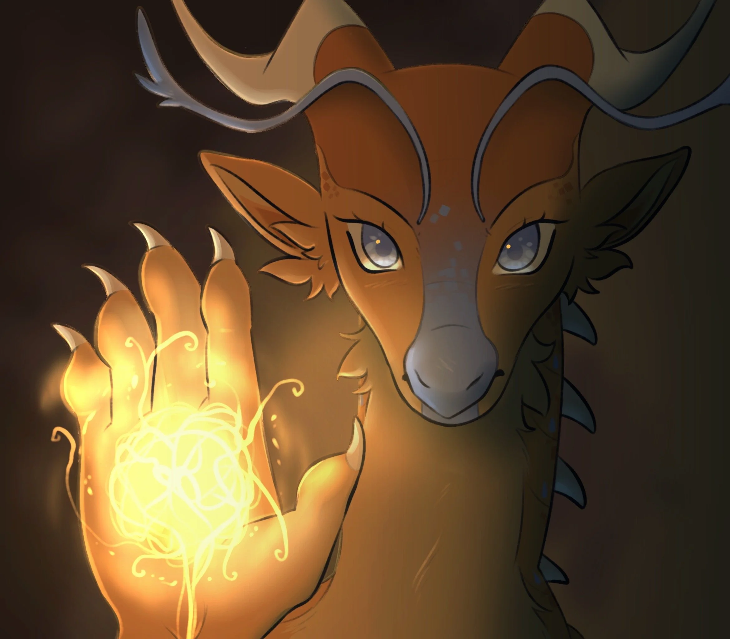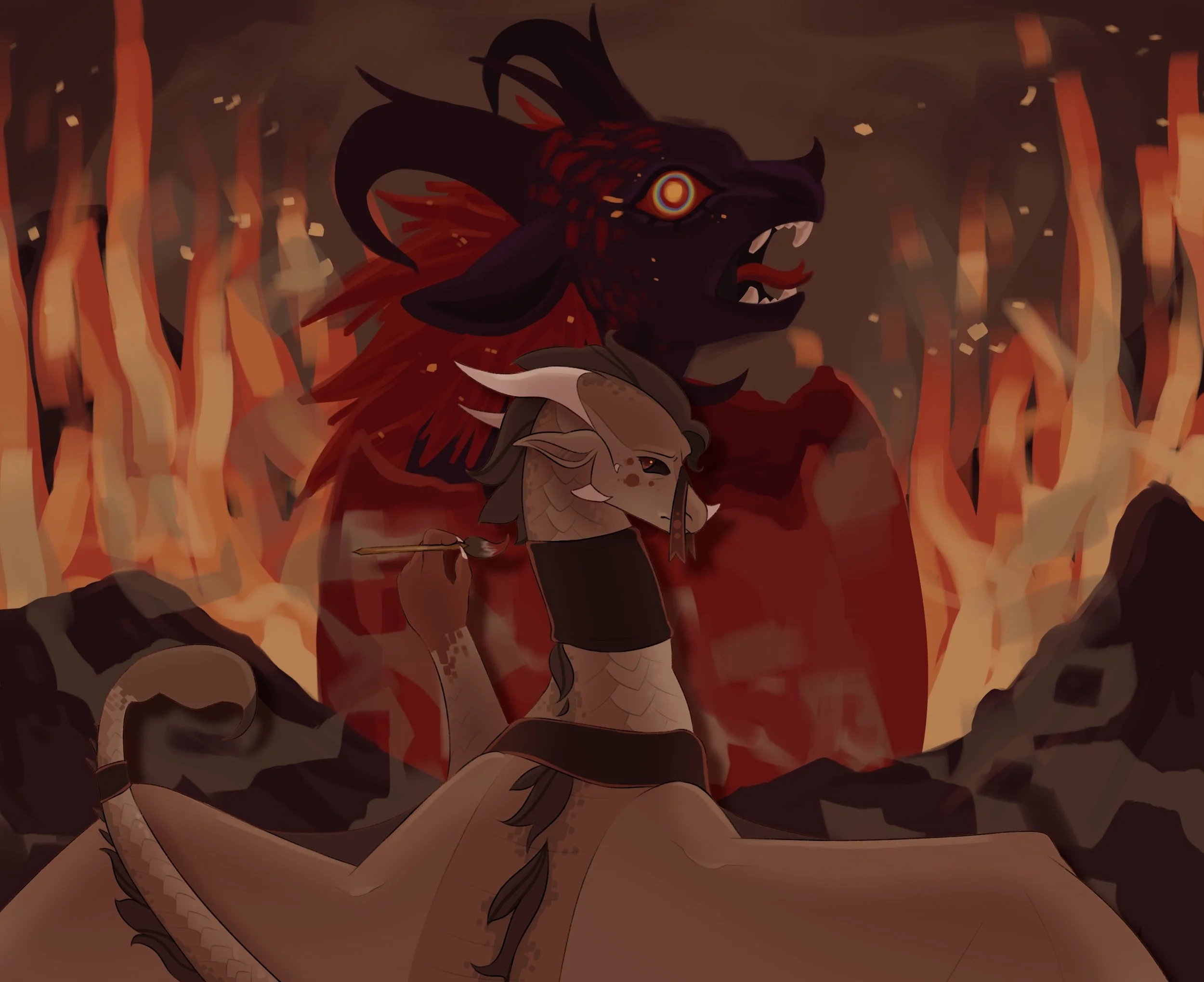 This piece is a portrait of my dragon character named Cherimoya, where a tangle of flaming silk is being shown to the viewer.