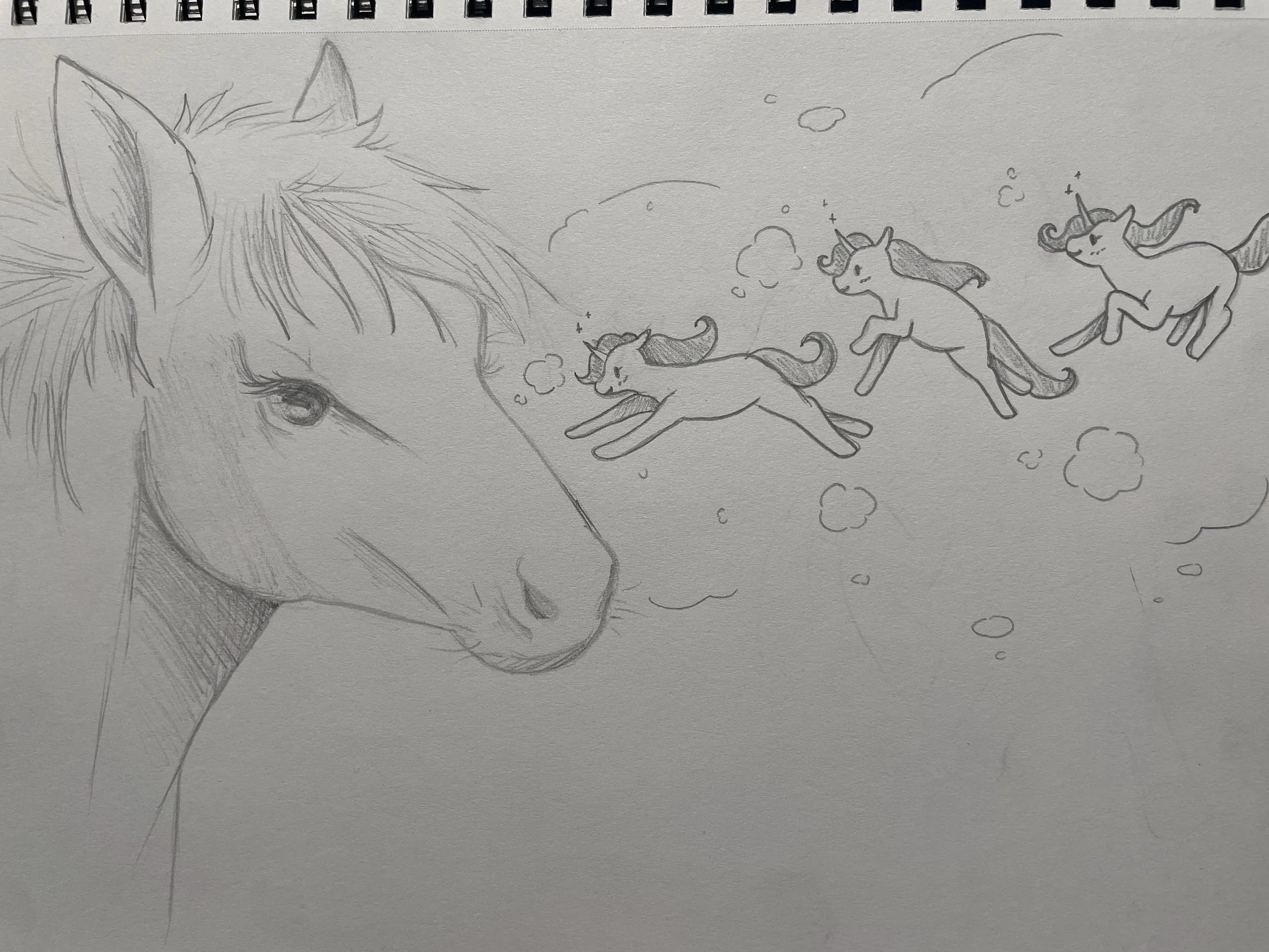 This is a pencil drawing of a horse pondering about cartoonish unicorns. It’s loosely inspired about the innate human desire to be something or someone else.