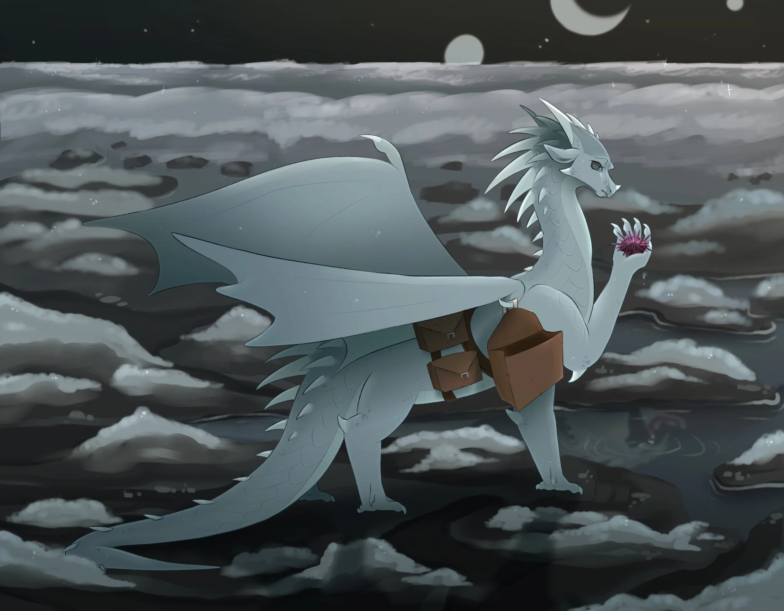This is a full scene of a dragon character, commissioned by a client. This piece displays an ice dragon pondering an urchin by the sea, deciding whether or not she should collect it.
