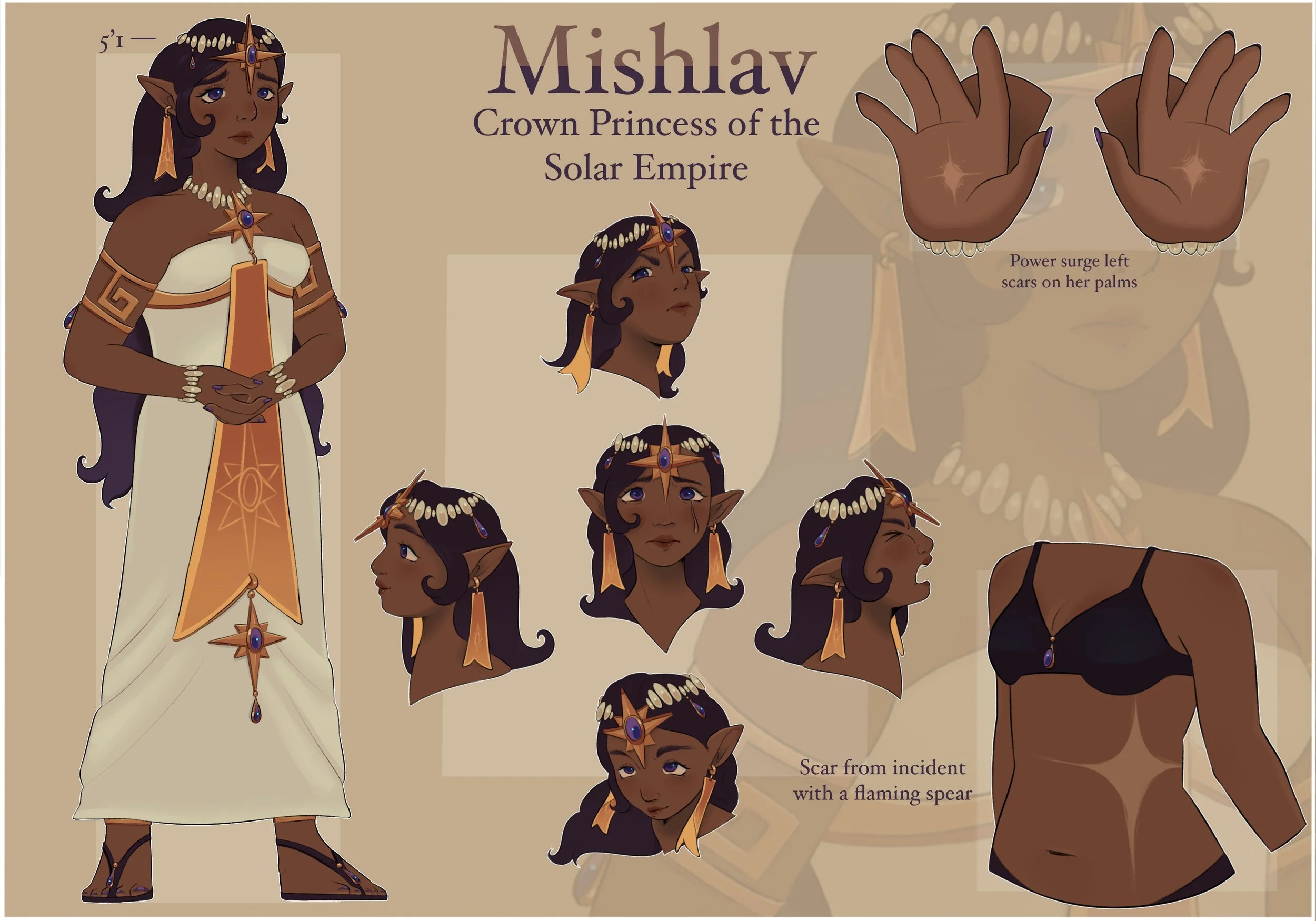This piece is a full character sheet of my original character, Mishlav. Specifically, it showcases the character’s personality and color palette.