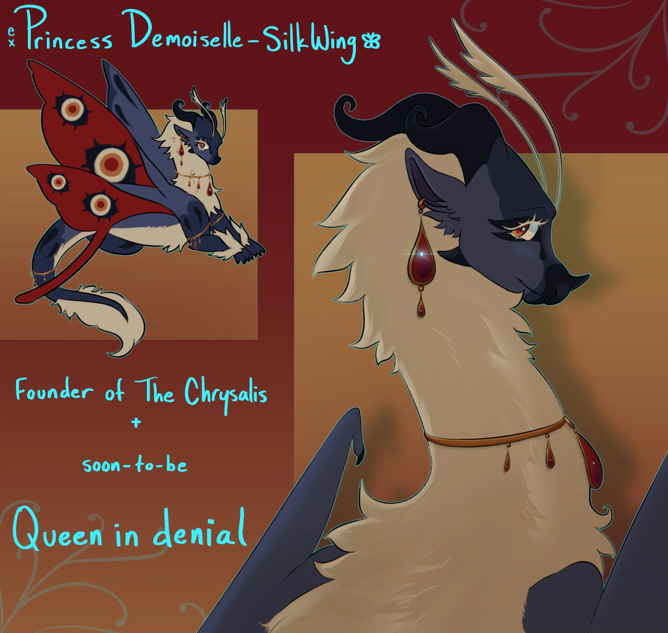 Here is a drawing of my butterfly dragon character, Demoiselle. She is drawn in two different styles, the left being more simplified, and the right being more detailed.